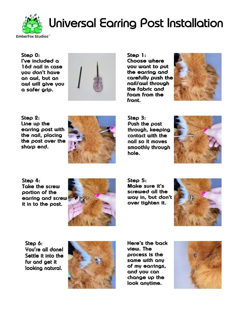 Note: These do require making a small hole through your fursuit ear with an awl, 16d nail, or similar. If you do not break the backing of the fur the hole will 'close up' whenever you take the earring out. Like an enamel pin, repeatedly re-poking holes around the same spot could damage the fabric. If in doubt, ask your fursuit maker if this product would work with your suit.